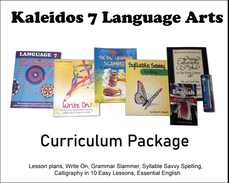Kaleidos 7 Lesson Plans, Write On, Big Bad Grammar Slammer, Syllable Savvy Spelling 7, Essential English, and Calligraphy in Ten Easy Lessons